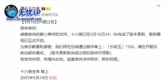 《燕云十六声》今日发布「悠悠凉州彻」版本更新,因为涵盖较多新内容和玩法优化,导致开服时间推迟。官方向玩家们道歉,并送出「长鸣玉」*100的补偿。目前游戏已完成更新并开服。《燕云十六声》今日发布「悠悠凉州彻」版本更新,因为涵盖较多新内容和玩法优化,导致开服时间推迟。官方向玩家们道歉,并送出「长鸣玉」*100的补偿。目前游戏已完成更新并开服。