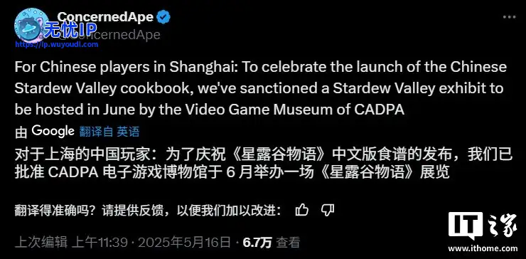 经典农场游戏《星露谷物语》的开发者ConcernedApe 今日宣布,为了庆祝《星露谷物语》中文版食谱的发布,将于 6 月在上海中国音数协游戏博物馆举办一场《星露谷物语》主题展览。经典农场游戏《星露谷物语》的开发者ConcernedApe 今日宣布,为了庆祝《星露谷物语》中文版食谱的发布,将于 6 月在上海中国音数协游戏博物馆举办一场《星露谷物语》主题展览。