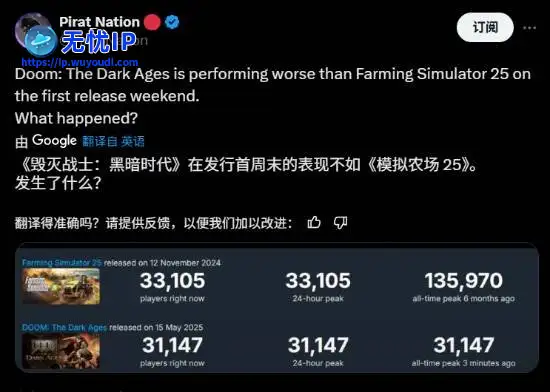 此外还有玩家晒出了刚发售的《毁灭战士:黑暗时代》与发售了6个月的《模拟农场25》的Steam在线人数对比图,疑惑的发问为什么这款DOOM新作在发售的首个周末Steam在线人数还不如《模拟农场25》。对于这个奇怪的对比,有人指出因为《毁灭战士:黑暗时代》已经加入了XGP,进而Steam上的玩家数不代表全部,但也有人很直白的表示就是无聊,玩不下去,宁愿去“种地”。此外还有玩家晒出了刚发售的《毁灭战士:黑暗时代》与发售了6个月的《模拟农场25》的Steam在线人数对比图,疑惑的发问为什么这款DOOM新作在发售的首个周末Steam在线人数还不如《模拟农场25》。对于这个奇怪的对比,有人指出因为《毁灭战士:黑暗时代》已经加入了XGP,进而Steam上的玩家数不代表全部,但也有人很直白的表示就是无聊,玩不下去,宁愿去“种地”。