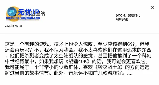 而M站的用户评论也对本作表达了失望,认为《黑暗时代》的游戏玩法无法与上一部作品的激烈和超快节奏相媲美;因此,它感觉不像是升级,而像是朝着错误方向迈出的一步。也有人认为米克·戈登的离开对最新作的配乐产生了影响。此外,游戏的系统要求相当高,但画面升级幅度不大。 而M站的用户评论也对本作表达了失望,认为《黑暗时代》的游戏玩法无法与上一部作品的激烈和超快节奏相媲美;因此,它感觉不像是升级,而像是朝着错误方向迈出的一步。也有人认为米克·戈登的离开对最新作的配乐产生了影响。此外,游戏的系统要求相当高,但画面升级幅度不大。