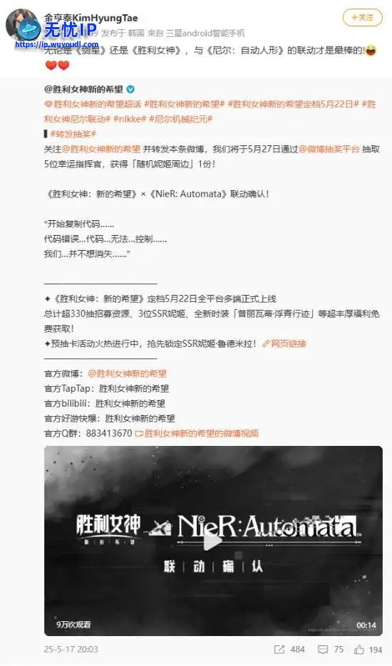 就在刚刚,韩国游戏开发商Shift Up创始人金亨泰在微博上转发了这条联动动态,并对《尼尔:机械纪元》大加称赞。就在刚刚,韩国游戏开发商Shift Up创始人金亨泰在微博上转发了这条联动动态,并对《尼尔:机械纪元》大加称赞。