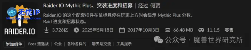 很多玩家并不知道,这是一个抓取玩家副本数据的插件,例如显示的玩家分数,当前钥匙,最高通关记录等,都是它来完成的Raider.io 从网站获取副本成就数据并在游戏中显示,不依赖战斗信息。Details - 2.724 亿下载:完全没法用