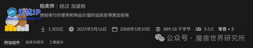 一个拍卖行买卖插件,不涉及战斗逻辑,暴雪不管。Bagnon - 1.351 亿下载:不受影响UI类插件,也就是大家的背包插件,只是改变背包显示方式。Hazzikostas 表示,UI 和外观类插件不受影响。Recount - 1.206 亿下载:已废Details 的竞争对手,同样无法存活。Pawn - 1.117 亿下载:可能不受影响伤害模拟插件,根据 Simulationcraft 计算的属性权重推荐装备升级,不依赖战斗数据。LittleWigs - 9460 万下载:完全没法用BigWigs 的副本版本,将随之被淘汰。RareScanner - 9460 万下载:可能不受影响用来提示稀有怪物刷新,若不依赖战斗日志或光环,可能继续运作。GTFO - 8420 万下载:完全没法用也就是伤害预警,比如你站在圈里,会有报警嘟嘟声。Hazzikostas 表示这类功能将内嵌到游戏中。World Quest Tracker - 8310 万下载:可能不受影响
