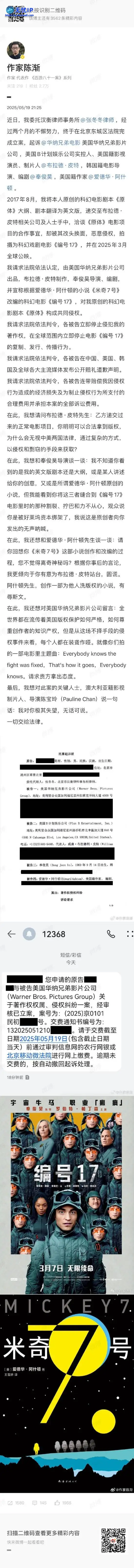 他表示已在北京东城区法院立案,起诉美国华纳兄弟影片公司、美国B计划娱乐公司实控人布拉德·皮特、韩国导演奉俊昊(《编号17》导演、编剧)、美国作家爱德华·阿什顿(《编号17》原作小说《米奇7号》作者),称“一切交给法律”。他表示已在北京东城区法院立案,起诉美国华纳兄弟影片公司、美国B计划娱乐公司实控人布拉德·皮特、韩国导演奉俊昊(《编号17》导演、编剧)、美国作家爱德华·阿什顿(《编号17》原作小说《米奇7号》作者),称“一切交给法律”。