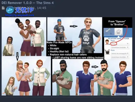 但就在近日,一款名叫“DEI Remover 1.0.0”的MOD引起了一些争议。这个模组可以将游戏中五花八门的角色选项全部更改成“异性恋”、“白人”以及“瘦子”角色,甚至把所有LGBTQ 情侣变成了兄弟姐妹。但就在近日,一款名叫“DEI Remover 1.0.0”的MOD引起了一些争议。这个模组可以将游戏中五花八门的角色选项全部更改成“异性恋”、“白人”以及“瘦子”角色,甚至把所有LGBTQ 情侣变成了兄弟姐妹。