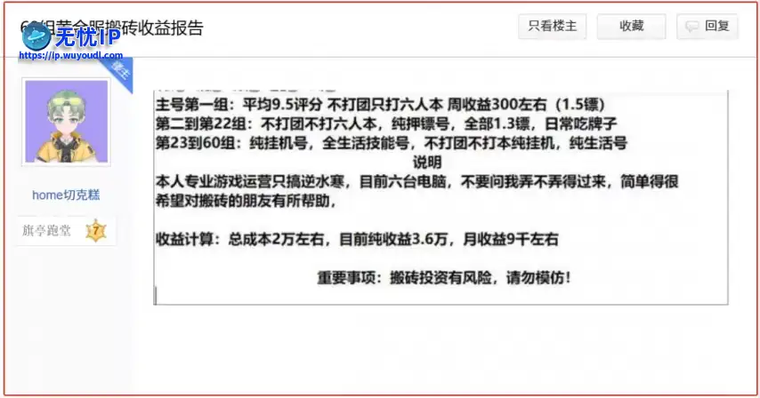 在入坑两个月之后,这位玩家就在黄金服中赚了3.6万元。考虑到投入了电脑和多账号的成本高达2万,他表示最初两个月收益“只有”9000块。而之后两个月时间,因为押镖收益增加和电脑账号成本早已回本的原因,每个月收益已经来到了19000,超过全国90%以上劳动者的薪资水平,接近“享受生活”的薪资挡位。在入坑两个月之后,这位玩家就在黄金服中赚了3.6万元。考虑到投入了电脑和多账号的成本高达2万,他表示最初两个月收益“只有”9000块。而之后两个月时间,因为押镖收益增加和电脑账号成本早已回本的原因,每个月收益已经来到了19000,超过全国90%以上劳动者的薪资水平,接近“享受生活”的薪资挡位。