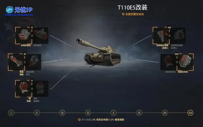 T110E5属于“全能重型坦克”。该车在战地改装达到满级后,可以获得额外的3%坦克生命值与 2%瞄准速度,还可以增加多项性能升级与1项配件加成栏位选择。性能改装玩家可以选择全地形悬挂、视差调整、隔音层、功率输出调谐(配置1)和轻量化车体以加强坦克战斗力,具体选择按照玩家战斗风格微调。玩家可以选择改进型通风系统/改进耐久/涡轮增压器/火炮垂直稳定器/高级光学观察镜等配件,以提升坦克的作战效能。T110E5属于“全能重型坦克”。该车在战地改装达到满级后,可以获得额外的3%坦克生命值与 2%瞄准速度,还可以增加多项性能升级与1项配件加成栏位选择。性能改装玩家可以选择全地形悬挂、视差调整、隔音层、功率输出调谐(配置1)和轻量化车体以加强坦克战斗力,具体选择按照玩家战斗风格微调。玩家可以选择改进型通风系统/改进耐久/涡轮增压器/火炮垂直稳定器/高级光学观察镜等配件,以提升坦克的作战效能。