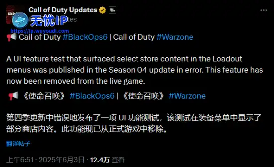 今日,动视官方回应称,“第四季更新中错误地发布了一项UI功能测试,该测试在装备菜单中显示了部分商店内容。此功能现已从正式游戏中移除。”今日,动视官方回应称,“第四季更新中错误地发布了一项UI功能测试,该测试在装备菜单中显示了部分商店内容。此功能现已从正式游戏中移除。”