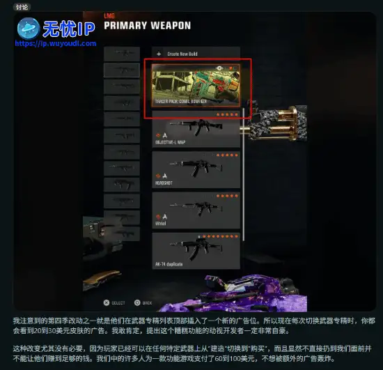 捆绑广告界面显然给玩家们带来了视觉上的不适,因为谁也不想在尝试编辑装备配置的时候看到强制推广、诱导付费的营销界面。还有观点认为,《使命召唤》已经是一款70美元的全价游戏,而这种满屏幕塞广告的行为自然令人难以接受。捆绑广告界面显然给玩家们带来了视觉上的不适,因为谁也不想在尝试编辑装备配置的时候看到强制推广、诱导付费的营销界面。还有观点认为,《使命召唤》已经是一款70美元的全价游戏,而这种满屏幕塞广告的行为自然令人难以接受。