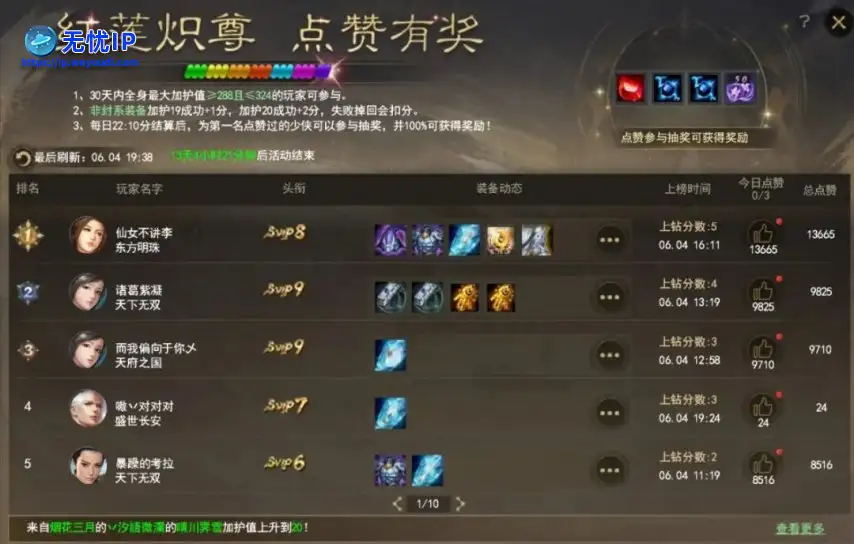 活动期间对所有非封系的装备进行19、20加护成功后将获得对应积分,加护19成功 1分,加护20成功 2分,并登上红莲炽尊录。同样的,当日22:10结算排名时,第一会获得“红莲炽者”标签,每日被点赞第一名会获得“最受瞩目”标签。活动期间对所有非封系的装备进行19、20加护成功后将获得对应积分,加护19成功 1分,加护20成功 2分,并登上红莲炽尊录。同样的,当日22:10结算排名时,第一会获得“红莲炽者”标签,每日被点赞第一名会获得“最受瞩目”标签。