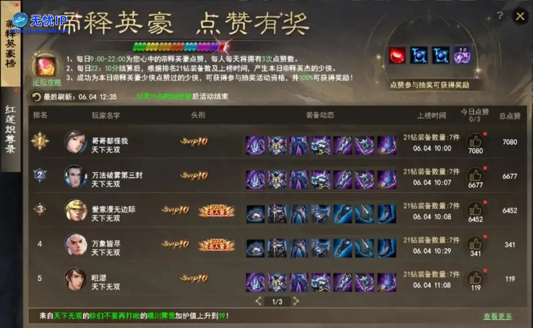 每日9:00-22:00,角色当前加护总数≥144的少侠可以分别为帝释英豪榜、红莲炽尊录上的少侠点赞,每日每个榜单有3次点赞机会。每日9:00-22:00,角色当前加护总数≥144的少侠可以分别为帝释英豪榜、红莲炽尊录上的少侠点赞,每日每个榜单有3次点赞机会。
