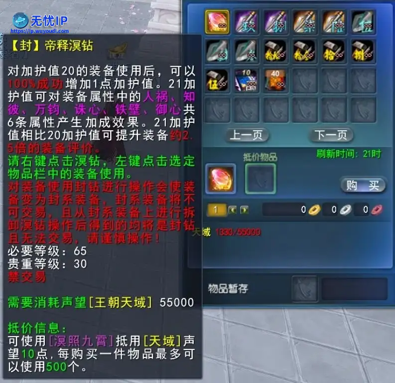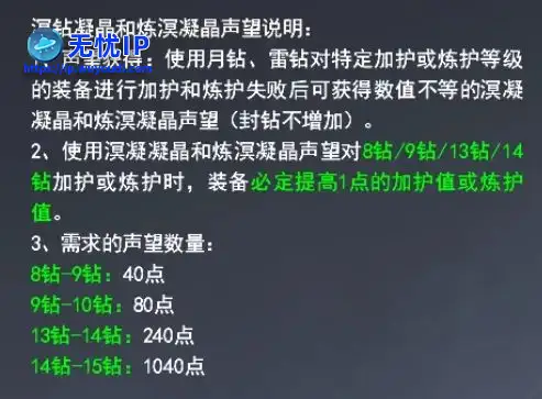 当少侠获得了若干溟钻凝晶、炼溟凝晶声望时,可以消耗对应声望,对8钻、9钻、13钻、14钻装备100%加护或炼护成功。每累积一定值的溟钻凝晶、炼溟凝晶,下次对加护值13钻、14钻的装备进行加护时,失败依旧停留在加护13钻、14钻,不会掉钻。当少侠获得了若干溟钻凝晶、炼溟凝晶声望时,可以消耗对应声望,对8钻、9钻、13钻、14钻装备100%加护或炼护成功。每累积一定值的溟钻凝晶、炼溟凝晶,下次对加护值13钻、14钻的装备进行加护时,失败依旧停留在加护13钻、14钻,不会掉钻。