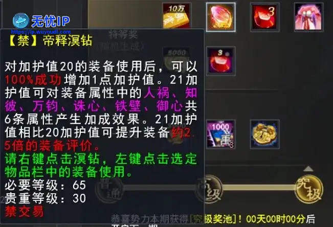 活动期间,系统将自动选择1件当前角色装备评价最高的禁交易18钻加护或18钻炼护装备(装备栏、包裹、武库中),给予1次加护或炼护18钻砸19钻时,失败不掉钻的神佑权限。当神佑装备同时满足加护/炼护值均为18钻时,则优先触发18钻加护失败不掉钻权限,若加护值不满足,则给予18钻炼护失败不掉钻的神佑权限,二者选一。活动期间,系统将自动选择1件当前角色装备评价最高的禁交易18钻加护或18钻炼护装备(装备栏、包裹、武库中),给予1次加护或炼护18钻砸19钻时,失败不掉钻的神佑权限。当神佑装备同时满足加护/炼护值均为18钻时,则优先触发18钻加护失败不掉钻权限,若加护值不满足,则给予18钻炼护失败不掉钻的神佑权限,二者选一。