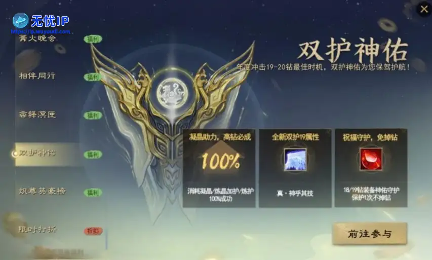除了为大家降低溟钻获取的成本,我们还同步开启了少侠们喜闻乐见的“双护神佑”活动,为大家的上钻之路提供又一重保障!除了为大家降低溟钻获取的成本,我们还同步开启了少侠们喜闻乐见的“双护神佑”活动,为大家的上钻之路提供又一重保障!