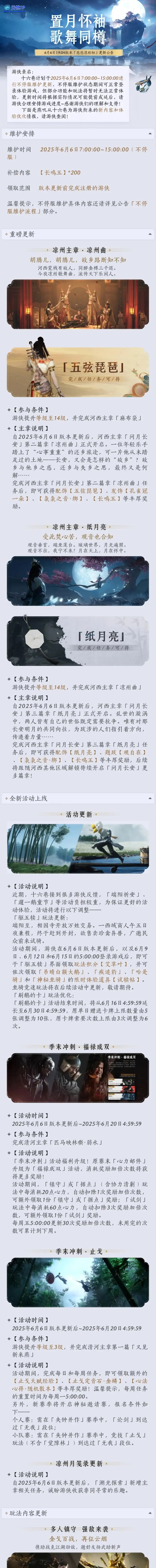 6月6日更新后,凉州主章「凉州曲」和「纸月亮」将在且歌且诉中鸣彻,在自我与他者的交响中,盼与游侠们找到新的共鸣。6月6日更新后,凉州主章「凉州曲」和「纸月亮」将在且歌且诉中鸣彻,在自我与他者的交响中,盼与游侠们找到新的共鸣。