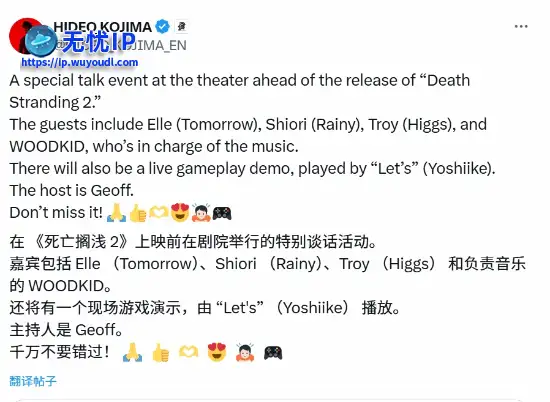 小岛秀夫在推文中激动地表示:“千万不要错过!”并配上了多个表情符号,表达了他对此次活动的期待。小岛秀夫在推文中激动地表示:“千万不要错过!”并配上了多个表情符号,表达了他对此次活动的期待。