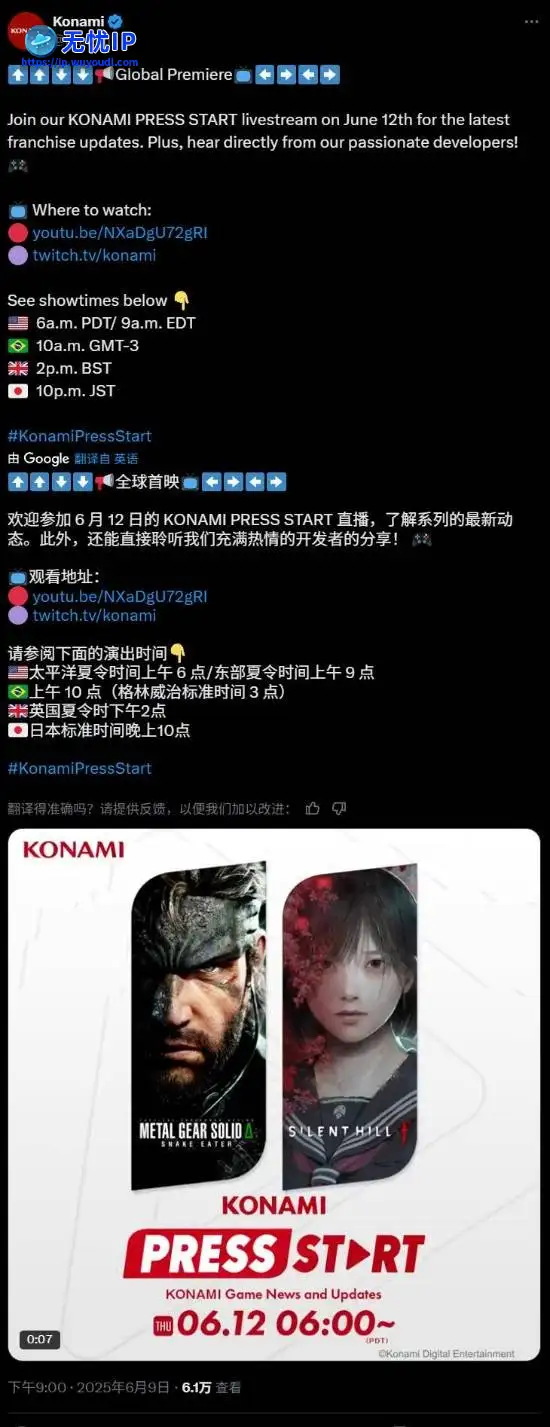 科乐美官方刚刚在推特发布公告,宣布将于北京时间6月12日晚21点举办“KONAMI PRESS START”,届时将会公布部分游戏的最新动态等内容,据其发布的宣传内容来看,《合金装备3:重制版》和《寂静岭f》都会亮相此次展会。科乐美官方刚刚在推特发布公告,宣布将于北京时间6月12日晚21点举办“KONAMI PRESS START”,届时将会公布部分游戏的最新动态等内容,据其发布的宣传内容来看,《合金装备3:重制版》和《寂静岭f》都会亮相此次展会。