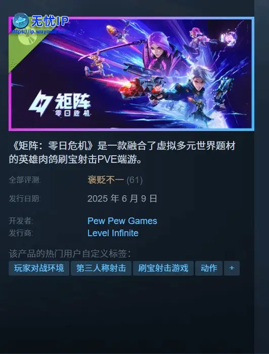 腾讯肉鸽射击 PVE 游戏《矩阵:零日危机》已经在Steam新品节开启试玩。6 月 10 日-6 月 17 日,玩家可以随意下载游戏的试玩版体验。腾讯肉鸽射击 PVE 游戏《矩阵:零日危机》已经在Steam新品节开启试玩。6 月 10 日-6 月 17 日,玩家可以随意下载游戏的试玩版体验。
