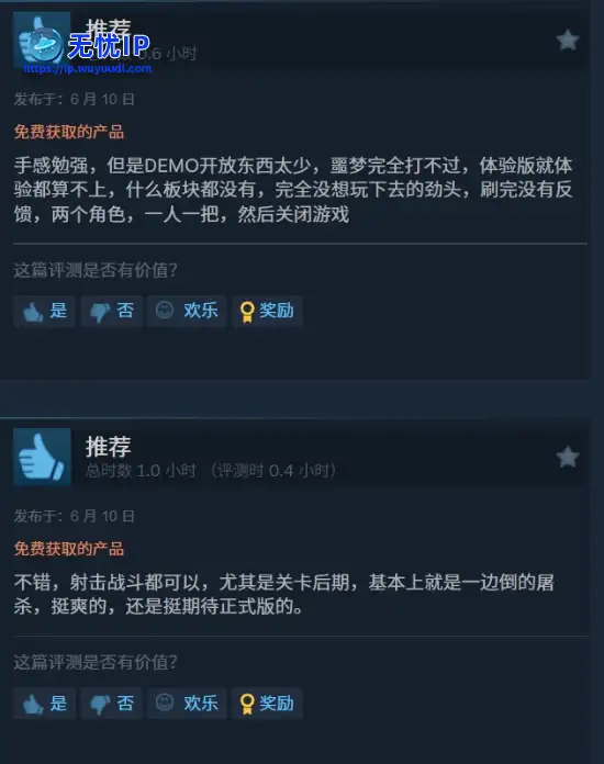 根据目前的Steam评测来看,本作的Demo获得了“褒贬不一”的评价,好评率为67%根据目前的Steam评测来看,本作的Demo获得了“褒贬不一”的评价,好评率为67%