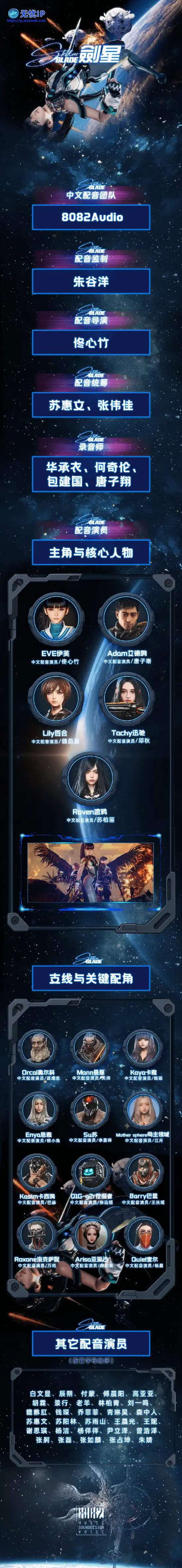 8082Audio今日公开了《剑星》的中文配音团队,女主伊芙的CV是大家熟悉的佟心竹老师(C小调),她还曾为《黑神话》中的萍萍配音。迅驰和百合的CV则是邱秋和魏茹晨,她们也是《黑神话》四妹和五妹的配音者。8082Audio今日公开了《剑星》的中文配音团队,女主伊芙的CV是大家熟悉的佟心竹老师(C小调),她还曾为《黑神话》中的萍萍配音。迅驰和百合的CV则是邱秋和魏茹晨,她们也是《黑神话》四妹和五妹的配音者。