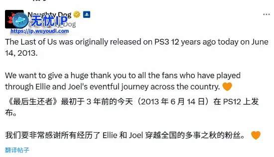 6月15日,顽皮狗官方账号发文庆祝:《最后生还者》初代游戏于2013年6月14日在PS3平台首次发布,至今已整整12年了!6月15日,顽皮狗官方账号发文庆祝:《最后生还者》初代游戏于2013年6月14日在PS3平台首次发布,至今已整整12年了!