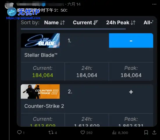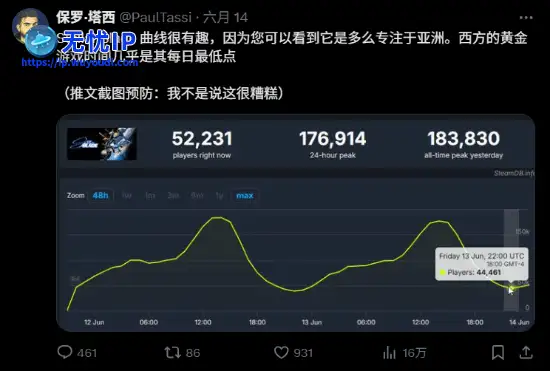 《福布斯》的游戏记者Paul Tassi近期试图分析《剑星》的受众,结果却遭到了玩家们嘲笑。他在X上指出,《剑星》的Steam在线数在西方玩家的“黄金游戏时段”达到了最低点,这表示该游戏的目标群体就是亚洲人。《福布斯》的游戏记者Paul Tassi近期试图分析《剑星》的受众,结果却遭到了玩家们嘲笑。他在X上指出,《剑星》的Steam在线数在西方玩家的“黄金游戏时段”达到了最低点,这表示该游戏的目标群体就是亚洲人。