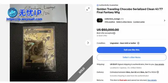 据了解,这次联动仅推出了77张金色“旅行陆行鸟卡”,且每张都有独特的编号。近日,其中一张编号为41/77的卡在eBay上被挂牌出售,起初售价高达20万美元,后调降至5万美元,并最终成交。据第三方估价工具推测,实际成交价可能在4万美元左右。据了解,这次联动仅推出了77张金色“旅行陆行鸟卡”,且每张都有独特的编号。近日,其中一张编号为41/77的卡在eBay上被挂牌出售,起初售价高达20万美元,后调降至5万美元,并最终成交。据第三方估价工具推测,实际成交价可能在4万美元左右。