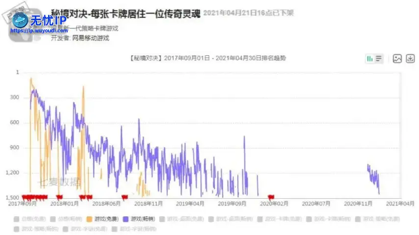 然而从排名状况看来,游戏似乎并没打出太强的影响力。上线之初也是《秘境对决》排名最好的时候,游戏最高在iOS免费榜排到过58名、在iOS畅销榜排到过215名,随后排名在整体趋势上一直在下滑。运营两年左右之后,游戏就基本已经滑出双榜之外了。然而从排名状况看来,游戏似乎并没打出太强的影响力。上线之初也是《秘境对决》排名最好的时候,游戏最高在iOS免费榜排到过58名、在iOS畅销榜排到过215名,随后排名在整体趋势上一直在下滑。运营两年左右之后,游戏就基本已经滑出双榜之外了。
