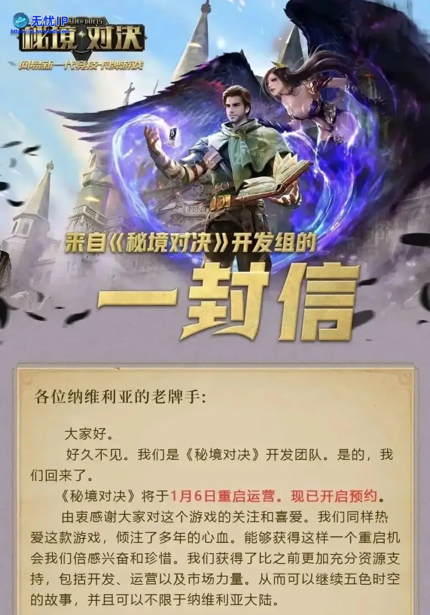 实际上,《秘境对决》在网易和暴雪分手的时候,已经复活过一次了。《秘境对决》于2017年9月上线,2021年4月下架,运营时间有三年半多。而后在2022奶奶12月23日,游戏官方突然发布了一封公开信,宣布游戏将在2023年1月6日重启运营,并公布了接下来一年多的更新计划。实际上,《秘境对决》在网易和暴雪分手的时候,已经复活过一次了。《秘境对决》于2017年9月上线,2021年4月下架,运营时间有三年半多。而后在2022奶奶12月23日,游戏官方突然发布了一封公开信,宣布游戏将在2023年1月6日重启运营,并公布了接下来一年多的更新计划。实际上,《秘境对决》在网易和暴雪分手的时候,已经复活过一次了。《秘境对决》《秘境对决》于2017年9月上线,2021年4月下架,运营时间有三年半多。而后在2022奶奶12月23日,游戏官方突然发布了一封公开信,宣布游戏将在2023年1月6日重启运营,并公布了接下来一年多的更新计划。
