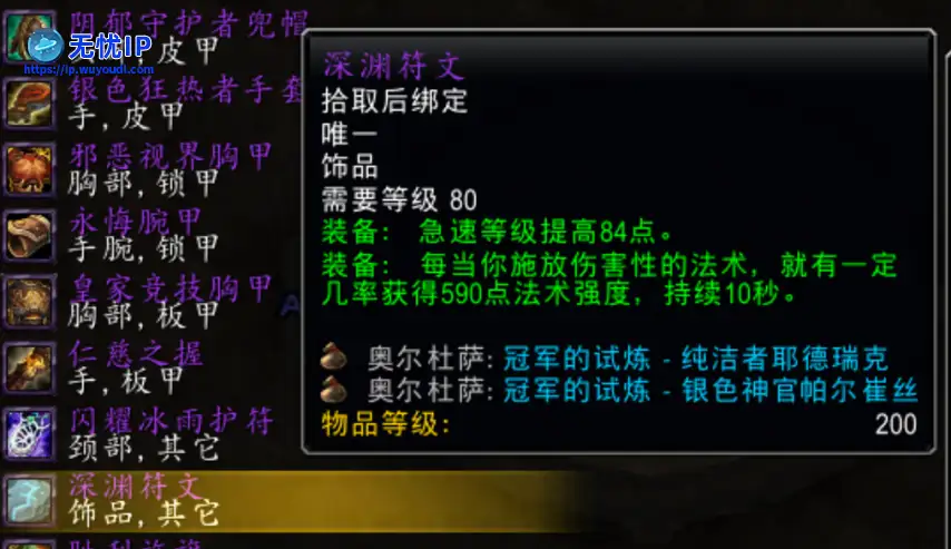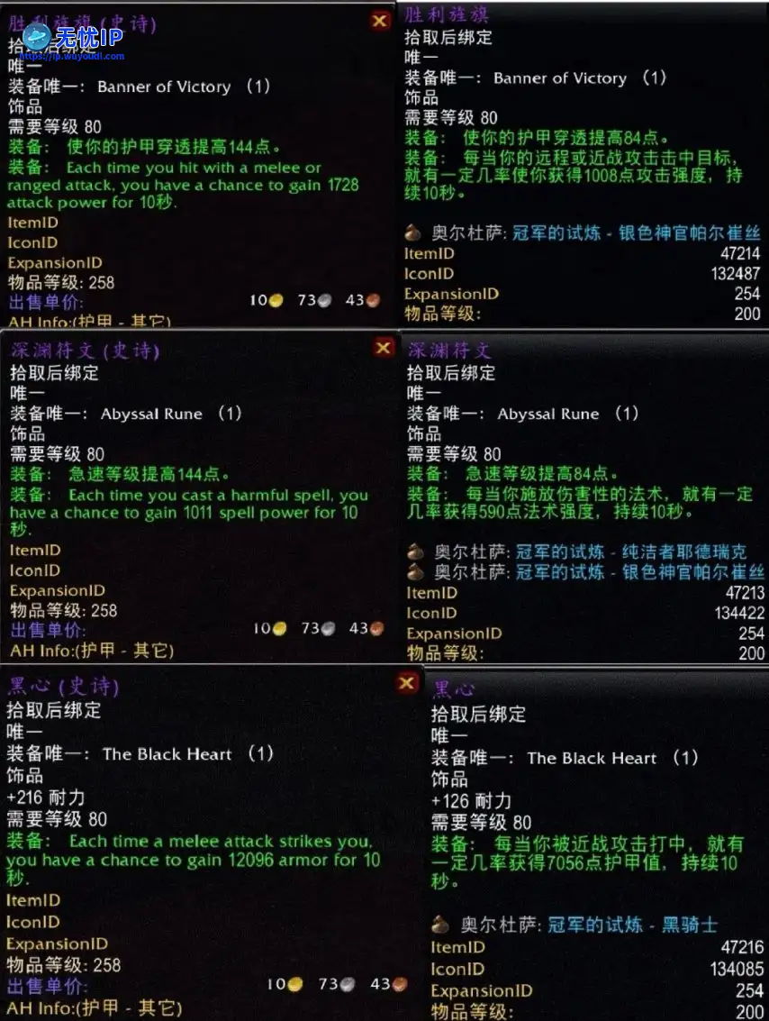 其实黑心、胜利旌旗和深渊符文的属性设计都是第一流的,仅仅吃了装等太低的亏,提升到258后,直接变身为准BIS饰品,虽说还没法和277装等的意志和外服比,但是和其他251~264饰品相比毫不逊色,甚至略有优点。这3件饰品提升到258装等后的属性,提升比为70%左右,属性如下表。