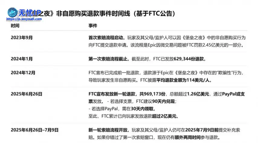 此次索赔流程始于2023年9月,是Epic因《堡垒之夜》微交易问题被处以2.45亿美元罚款的一部分。首次索赔流程从2023年9月持续到2024年1月,如果你错过了该期限,现在你还有额外的两周时间可以从Epic Games获得退款。此次索赔流程始于2023年9月,是Epic因《堡垒之夜》微交易问题被处以2.45亿美元罚款的一部分。首次索赔流程从2023年9月持续到2024年1月,如果你错过了该期限,现在你还有额外的两周时间可以从Epic Games获得退款。