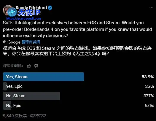 据外媒Payground报道,Gearbox Software的首席执行官Randy Pitchford发布了一项调查,询问玩家们对《无主之地4》等游戏在Epic Games Store和Steam等商店独占的看法。他邀请玩家们投票,如果预购会影响独占决定,玩家们是否会在他们最喜欢的平台上预购《无主之地4》。据外媒Payground报道,Gearbox Software的首席执行官Randy Pitchford发布了一项调查,询问玩家们对《无主之地4》等游戏在Epic Games Store和Steam等商店独占的看法。他邀请玩家们投票,如果预购会影响独占决定,玩家们是否会在他们最喜欢的平台上预购《无主之地4》。