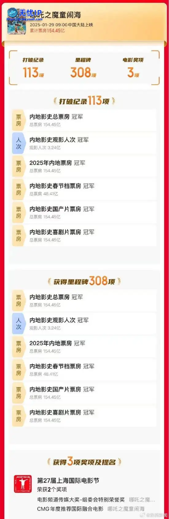 据网络平台数据,电影《哪吒之魔童闹海》密钥将于今日到期,累计总票房154.45亿,总观影人次3.24亿,上映至今共打破113项纪录,获得308项里程碑成就。据网络平台数据,电影《哪吒之魔童闹海》密钥将于今日到期,累计总票房154.45亿,总观影人次3.24亿,上映至今共打破113项纪录,获得308项里程碑成就。