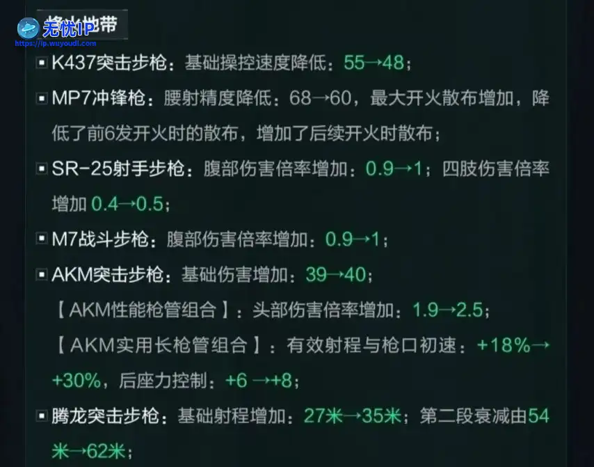 M7战斗步枪加强,虽然削弱了据枪让M7应该只能满改使用了,但是对腹部伤害倍率提升还是不错的,让M7可以稳定打躯干4枪倒人。M7战斗步枪加强,虽然削弱了据枪让M7应该只能满改使用了,但是对腹部伤害倍率提升还是不错的,让M7可以稳定打躯干4枪倒人。