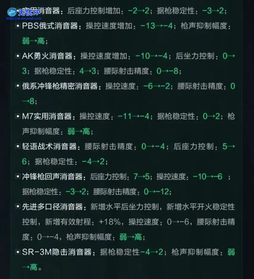 最后是消音器集体大幅加强,对于操控速度、后坐力控制和据枪都有大幅提升(除了冲锋枪回声消音),也是为了抵消一部分剧枪削弱的影响吧!资金充足的小伙伴可以先屯一些,赛季初消音这么大加强肯定是要涨涨价的,到时候自己用也不亏。最后是消音器集体大幅加强,对于操控速度、后坐力控制和据枪都有大幅提升(除了冲锋枪回声消音),也是为了抵消一部分剧枪削弱的影响吧!资金充足的小伙伴可以先屯一些,赛季初消音这么大加强肯定是要涨涨价的,到时候自己用也不亏。