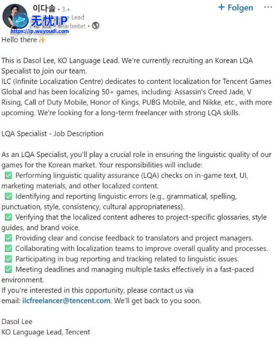近日,腾讯旗下的韩国语言负责人Dasol Lee发布招聘信息,宣布正在为其本地化团队招聘一名韩语本地化质检(LQA)专家。近日,腾讯旗下的韩国语言负责人Dasol Lee发布招聘信息,宣布正在为其本地化团队招聘一名韩语本地化质检(LQA)专家。