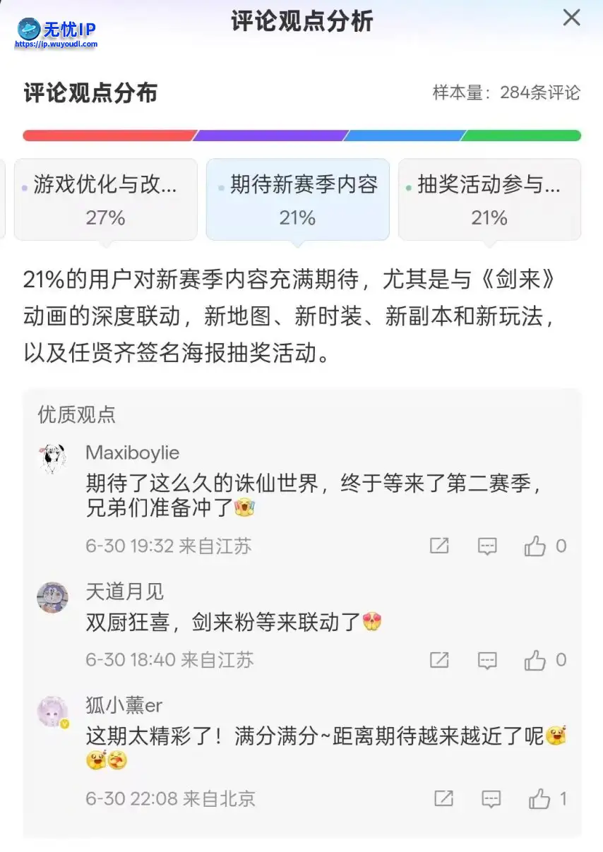 因官方账号发布的内容,往往伴随转发抽奖活动,所以关于抽奖评论的占比达到了21%,在去除21%对新赛季表示明确期待的仙友,剩余58%仙友或表示了质疑,或希望有更多的功能、玩法等上线。因官方账号发布的内容,往往伴随转发抽奖活动,所以关于抽奖评论的占比达到了21%,在去除21%对新赛季表示明确期待的仙友,剩余58%仙友或表示了质疑,或希望有更多的功能、玩法等上线。