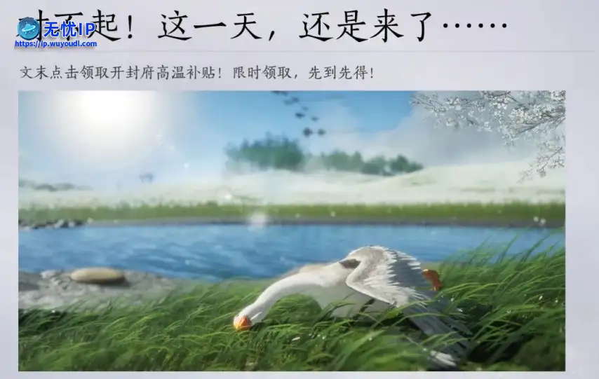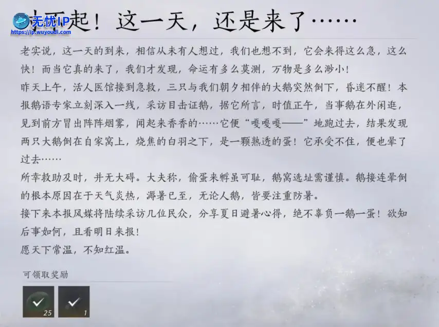 跑题了,各位少东家肯定好奇要说“外面天气热,关我们燕云什么事”燕云在今日的更新中又悄悄藏了许多小东西哦~首先,就是上线即可领取的高温补贴!看配图,大鹅都已经热倒了!各位少东家快快上线领取长鸣玉与绕梁之音吧!跑题了,各位少东家肯定好奇要说“外面天气热,关我们燕云什么事”燕云在今日的更新中又悄悄藏了许多小东西哦~首先,就是上线即可领取的高温补贴!看配图,大鹅都已经热倒了!各位少东家快快上线领取长鸣玉与绕梁之音吧!