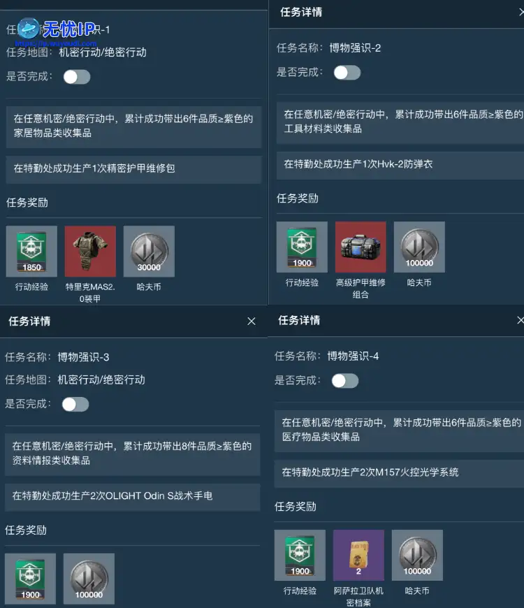 博物强识相关任务主要分为带出物资和在特勤处生产指定物资。博物强识相关任务主要分为带出物资和在特勤处生产指定物资。