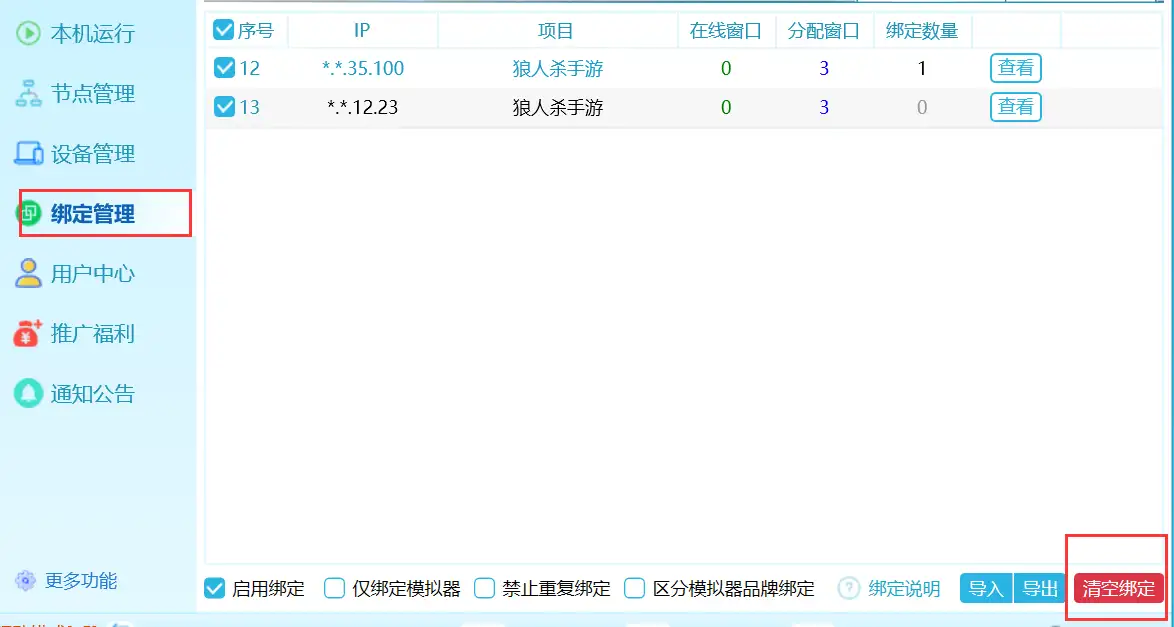 在绑定管理中,节点栏 绑定数量中会显示当前已经绑定了几个模拟器序号,点击查看,可以查看详情