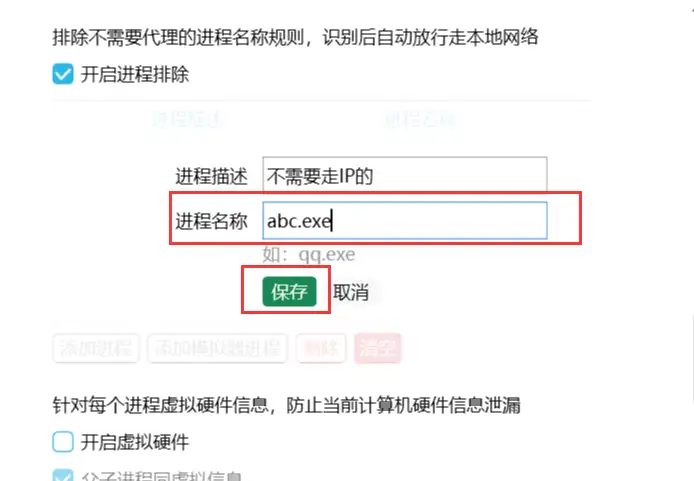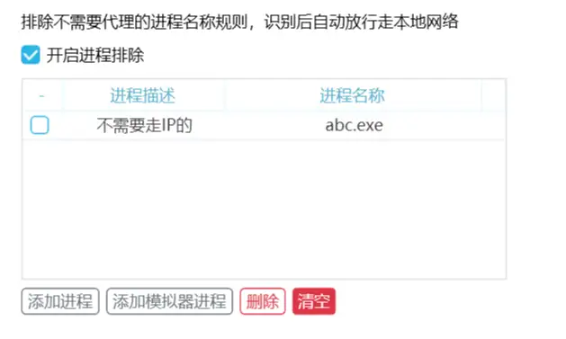 进程名称:abc.exe ,不需要走IP的进程名