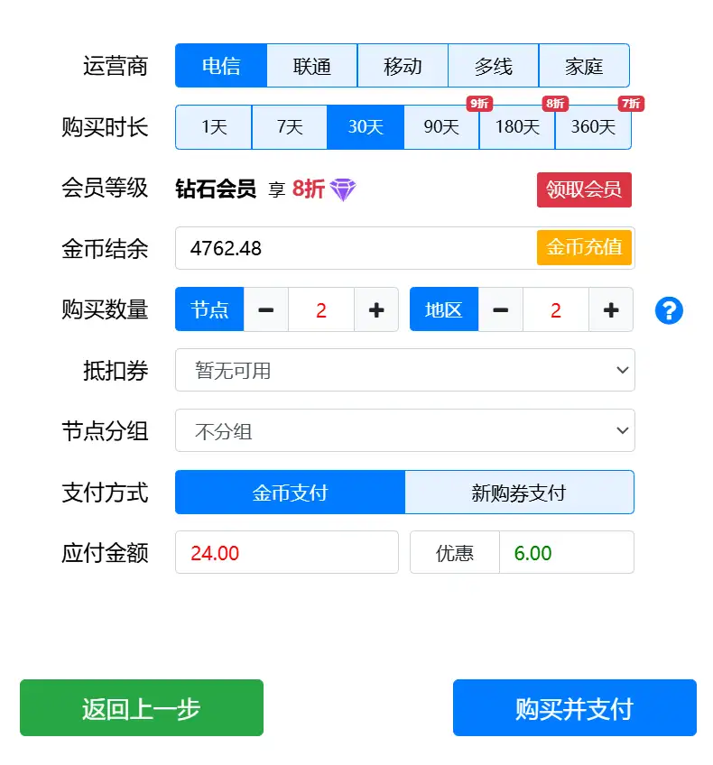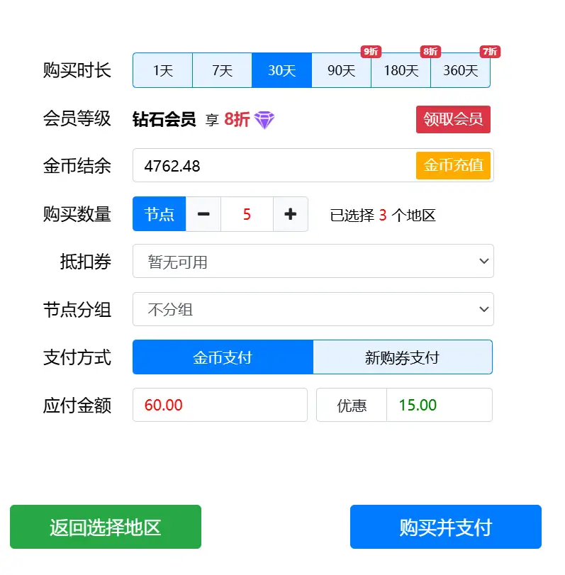 购买时长:默认30天,可以自己选择其他时长,购买时长越大越划算,90天、180天、360天还有时长折扣。