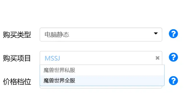 在购买项目栏里输入 项目名字或者其中几个字,也可以输入名称的首个字母,例如:魔兽世界,可以输入“魔兽” 或者 “MSSJ”,然后找到项目名称,选中就可以了。