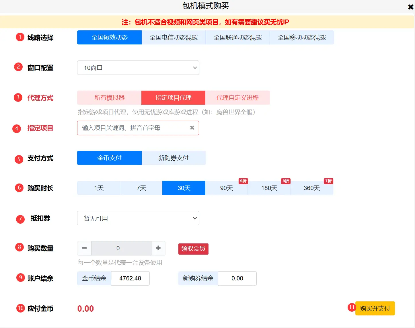 6、购买时长,默认30天,可以自己选择其他时长,购买时长越大越划算,90天、180天、360天还有时长折扣。