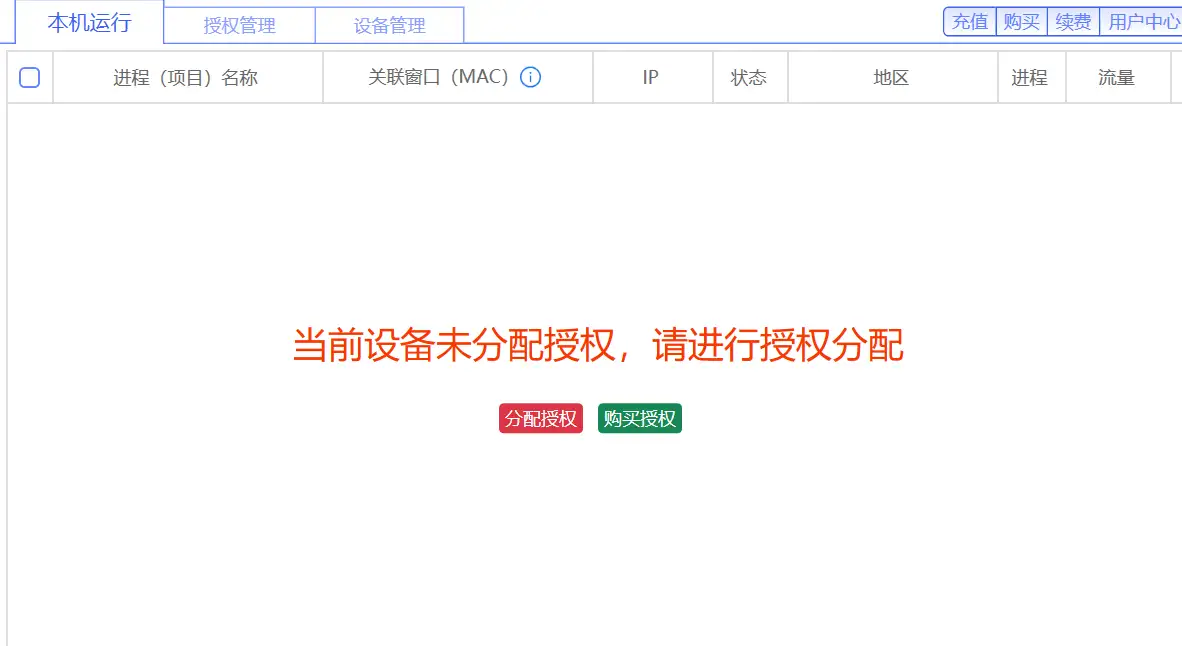如果 本机运行中 出现这个页面,说明当前设备还未分配授权,需要手动分配授权。