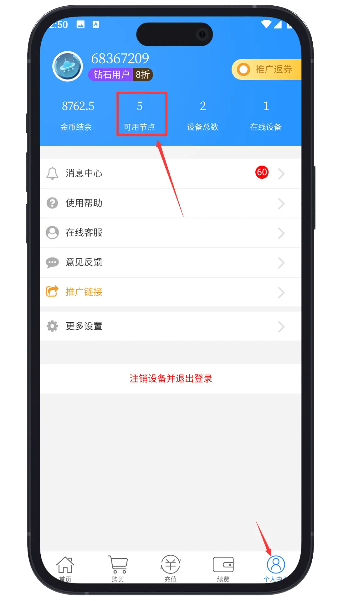 如需使用账号下其他节点,点击个人中心,点击可用节点